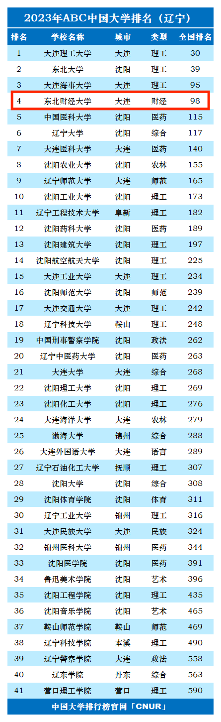 2023年,根据ABC中国大学排名结果显示,东北财经大学排名全国第98,位列辽宁省第4;2022年全国排名第76,下降22名,最新中国大学评级结果为A2。