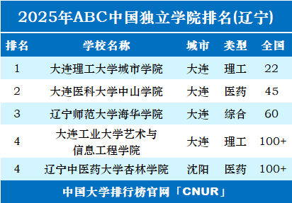 排名结果显示,辽宁上榜5所。大连理工大学城市学院全国排名22,位列第一;大连医科大学中山学院(45)、辽宁师范大学海华学院(60)进入前三。