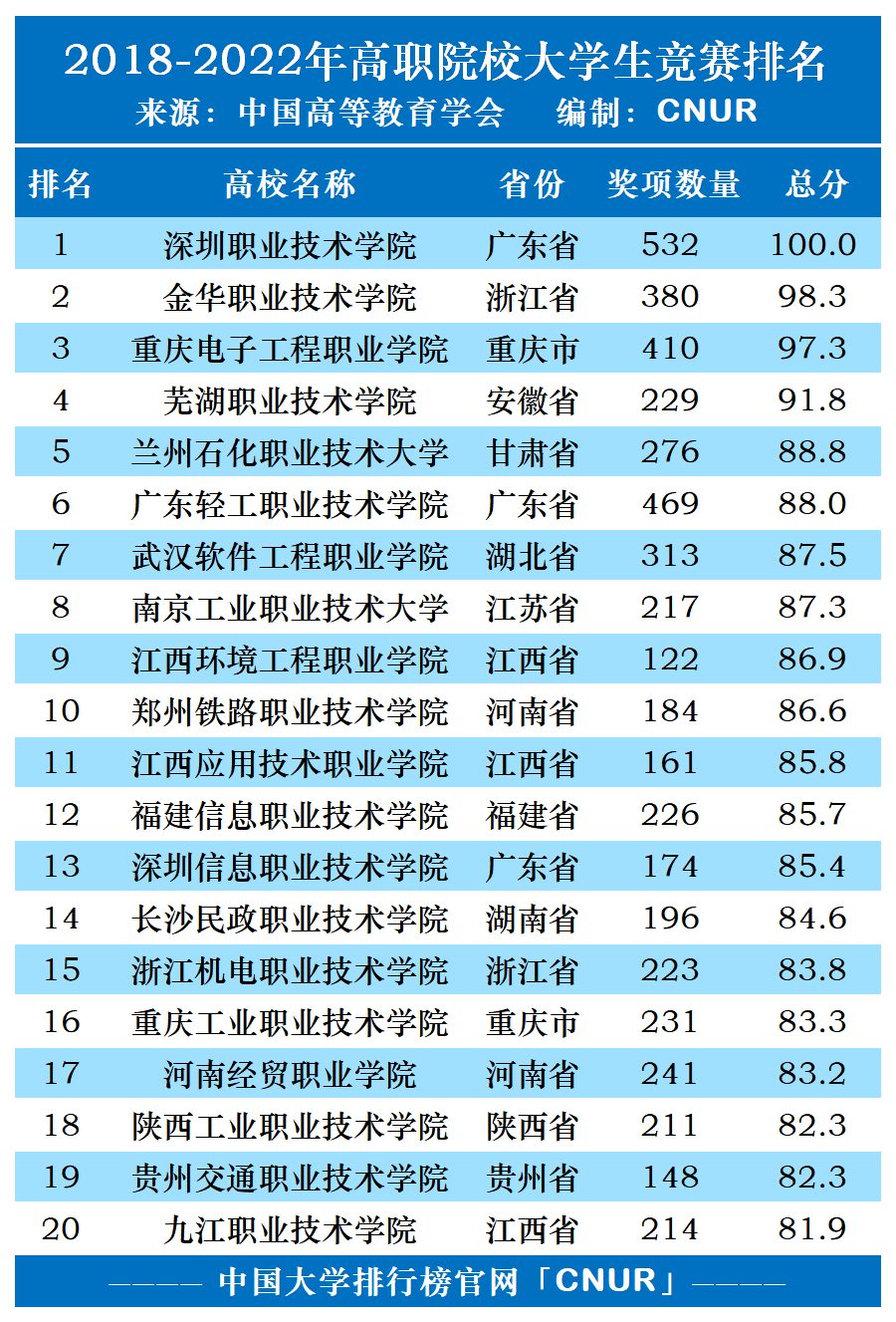 2018-2022年高职院校总榜前三分别为深圳职业技术学院、金华职业技术学院以及重庆电子工程职业学院,第四至第十分别为芜湖职业技术学院、兰州石化职业技术、广东轻工职业技术学院、武汉软件工程职业学院、南京工业职业技术大学、江西环境工程职业学院以及郑州铁路职业技术学院。