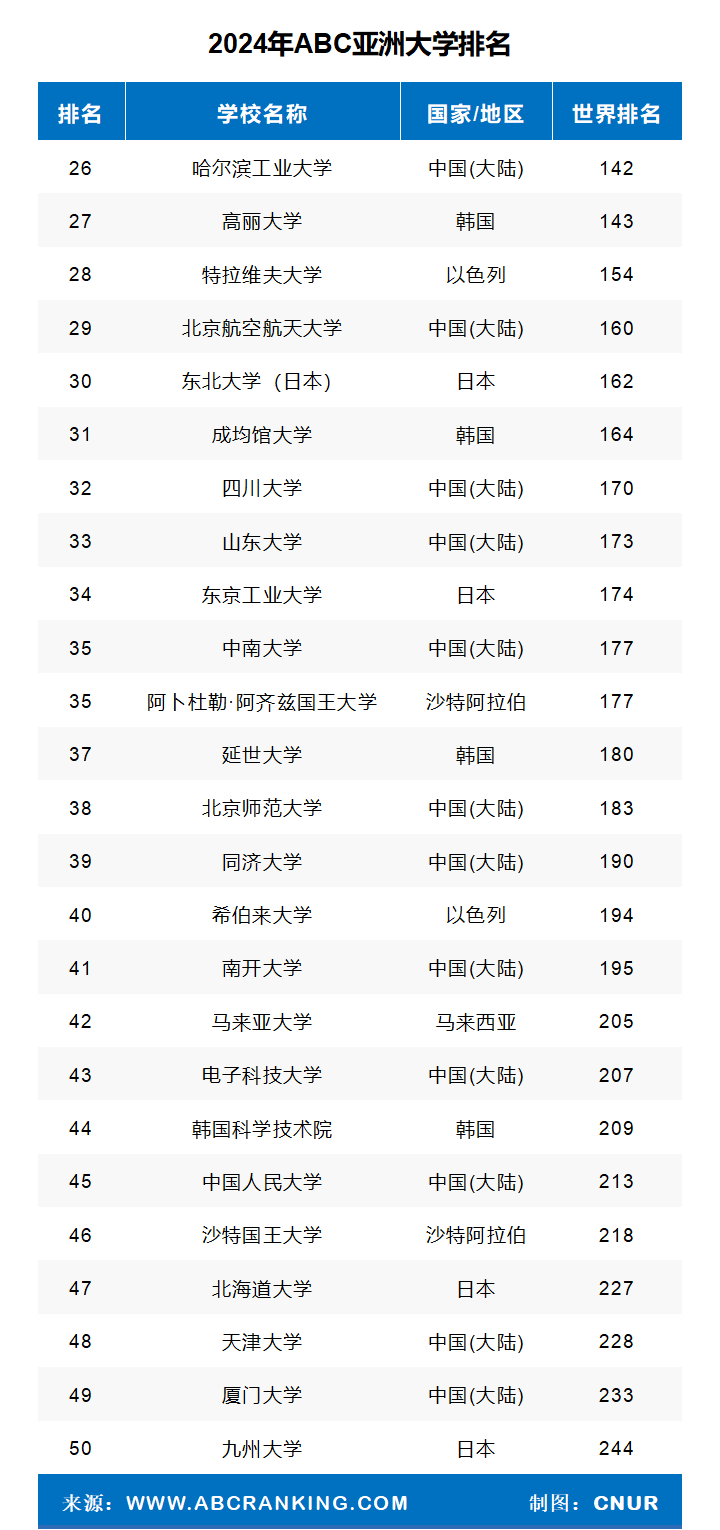 ABC世界大学排名(ABCWUR, ABC World University Rankings),由ABC咨询机构独家编制,是代表东方观点的世界大学综合性排名。评价基于世界大学评级结果,分段量化比较,指标设有学术研究、毕业生、教育资源、全球化和综合声誉五大模块,是权威的世界大学排名。