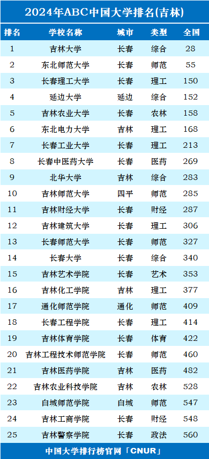 排名结果显示,吉林省共上榜25所。吉林大学位居全国第28、省内第1,东北师范大学位居全国第55、省内第2,长春理工大学位居全国第150、省内第3,延边大学位居全国第152、省内第4,吉林农业大学位居全国第158、省内第5,东北电力大学位居全国第168、省内第6,长春工业大学位居全国第213、省内第7。其余上榜高校分别为长春中医药大学、北华大学、吉林师范大学、吉林财经大学、吉林建筑大学等。