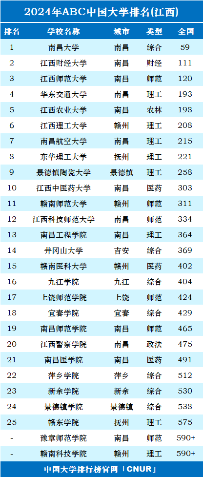 排名结果显示,江西省共上榜27所。南昌大学位居全国第59、省内第1,江西财经大学位居全国第111、省内第2,江西师范大学位居全国第120、省内第3,华东交通大学位居全国第193、省内第4,江西农业大学位居全国第198、省内第5,江西理工大学位居全国第208、省内第6,南昌航空大学位居全国第215、省内第7。其余上榜高校分别为东华理工大学、景德镇陶瓷大学、江西中医药大学、赣南师范大学、江西科技师范大学等。